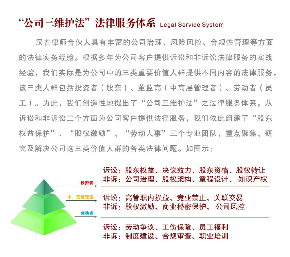 公司法领域主要服务范围:股东权利保护、股权激励、股权并购、公司治理、法律风险与控制、集团公司组建、章程设计、公司清算与注销、争议解决及诉讼代理。